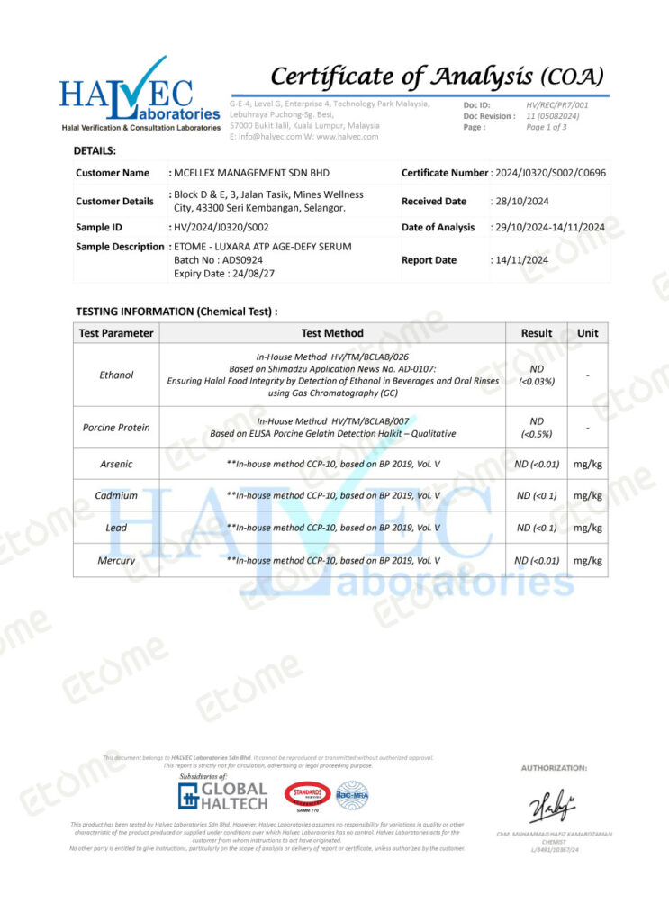 This test report confirms that the Etome – LUXARA ATP Age-Defy Serum has been tested for the presence of heavy metals and other components, ensuring compliance with halal and safety standards.